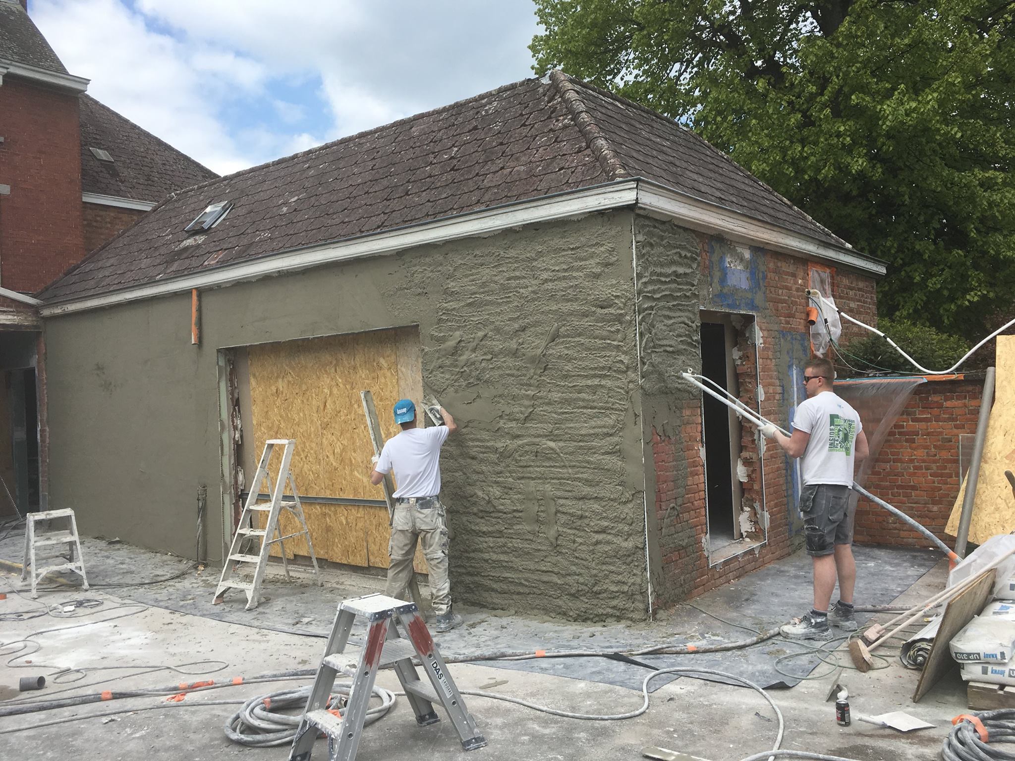 Bezettingswerken zijn onze hoofdactiviteit. Zo kunnen we niet alleen muren en plafonds bezetten, maar evengoed het pleisterwerk rond ramen en deuren aanpakken. Om muren en plafonds in het bijzonder te bepleisteren, gebruiken we een airless spuitmachine.